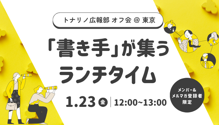 トナリノ広報部は、これらの仕事を手がけている「書き手」——ライターや編集者、事業会社の担当者(PR/広報、人事・採用、総務、マーケティング)など——が集い、実務に役立つ情報を交換をしたり、互いに知見を深めあったりすることを目的として運営しています。