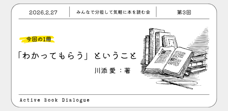 日々の仕事が忙しくて、なかなか本を読む時間がとれない……という方、多いのではないでしょうか。今回は「アクティブ・ブック・ダイアローグ®」という読書手法を応用し、複数人で1冊の本を分担して読み、その内容をシェアし合う形式の … 続きを読む 【イベント案内】「みんなで分担して気軽に本を読む会」第3回【オンライン】